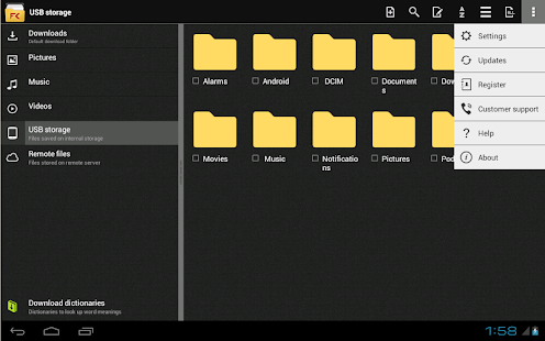 File Commander is organized in several useful shortcuts giving quick access to local files, remotely stored files or to files from the same type: